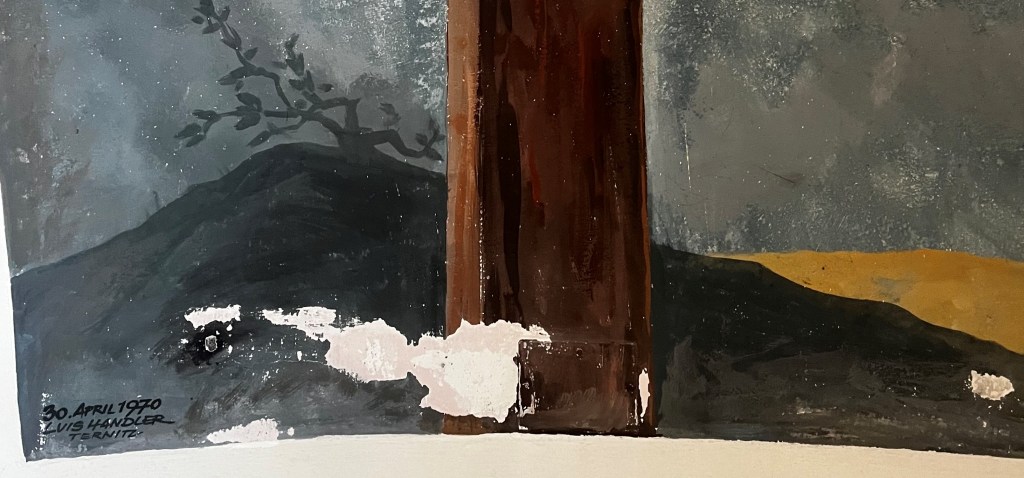 This is an example of the restoration work of Verena Bauer. The task was to unobtrusively repair the broken areas of a holy chapel painting from 1970.